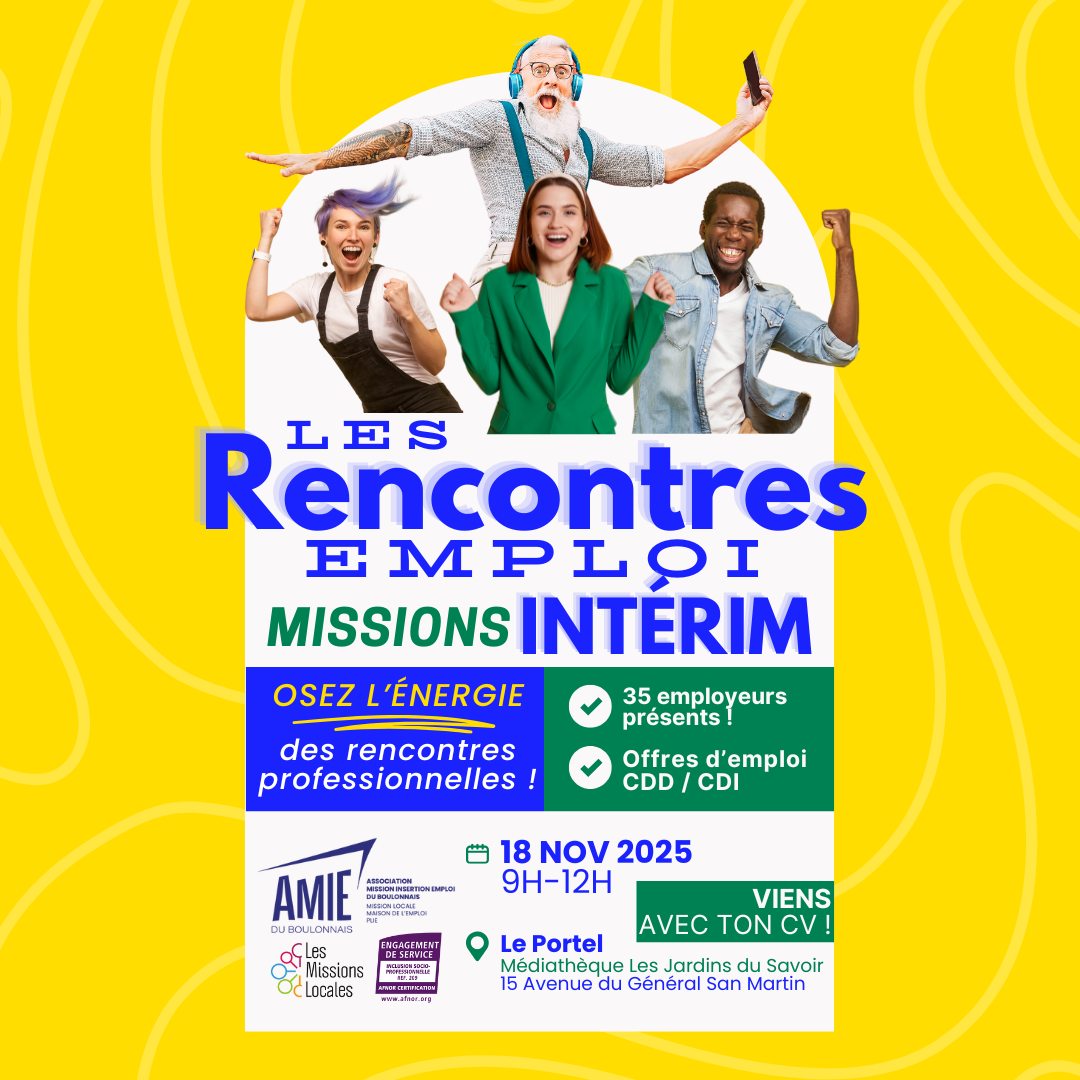 Rencontre emploi missions intérim par l'AMIE du boulonnais, de 8h à 14h à la médiathèque.