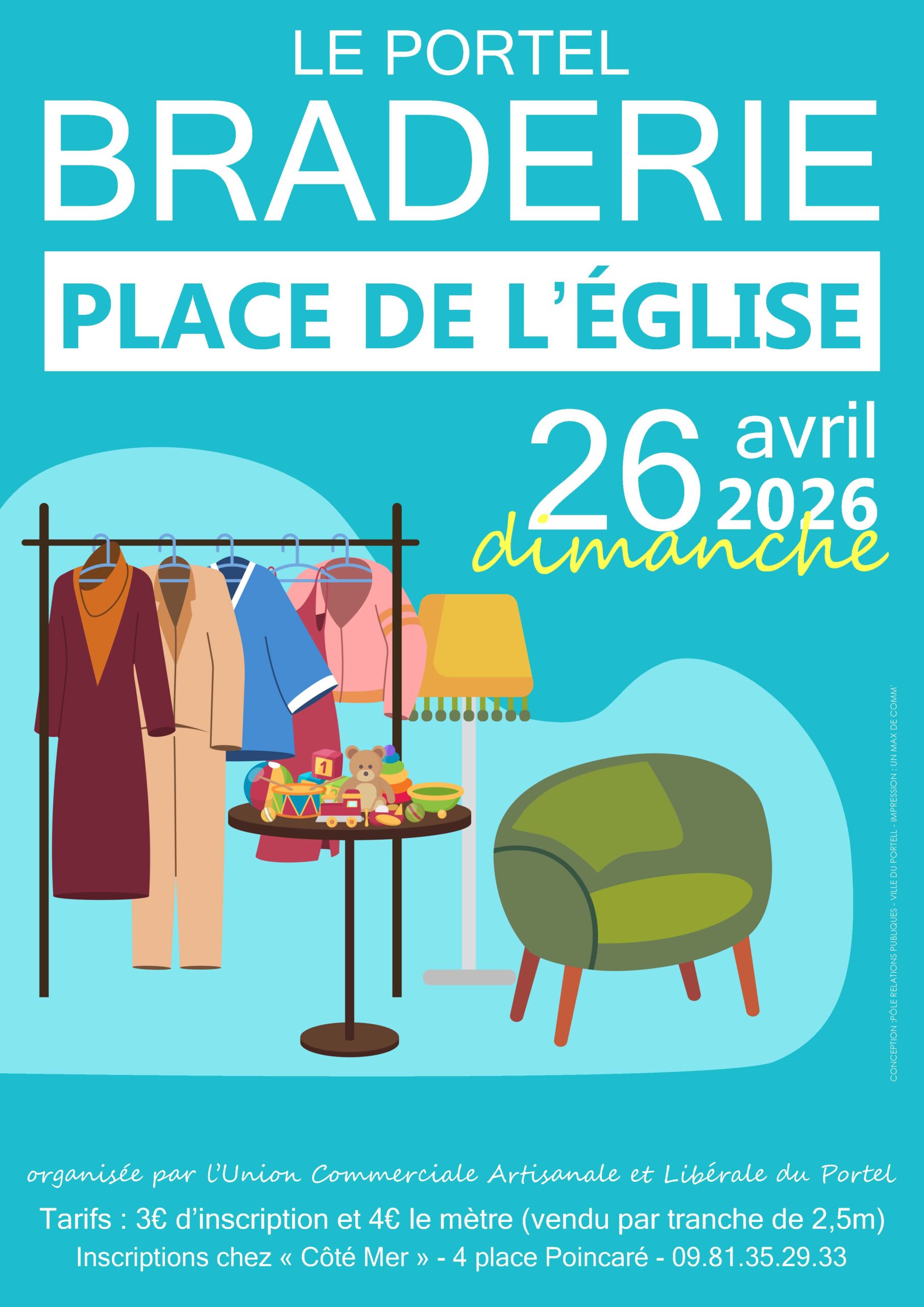 Braderie Place de l'Eglise Dimanche 26 avril Organisée par l'UCALP Renseignements et inscriptions auprès de Côté Mer au 09.81.35.29.33