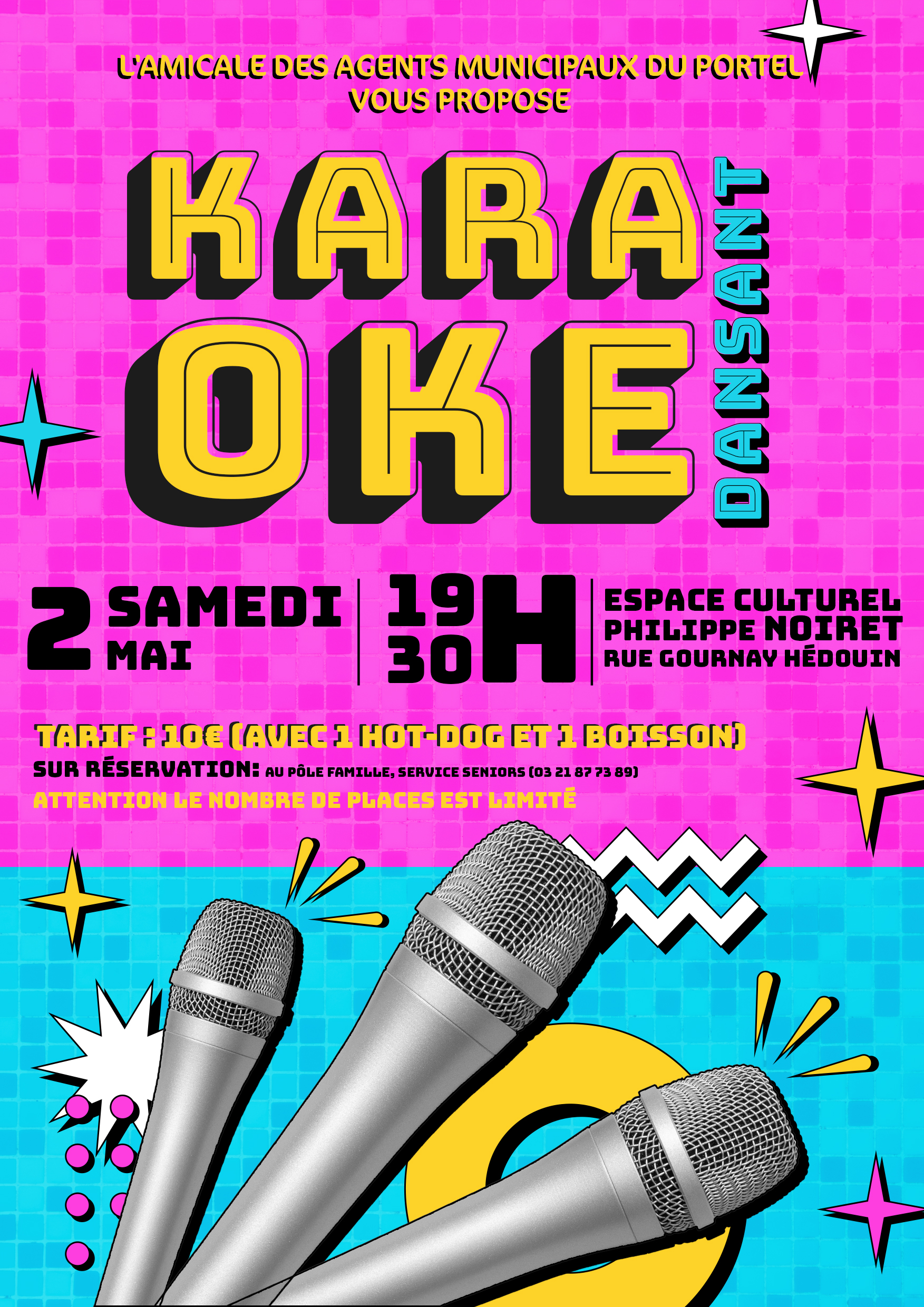 Soirée karaoké organisée par l'Amicale des Agents Municipaux dès 19h30 salle Philippe Noiret Tarif : 10€ avec 1 hotdog et 1 boisson Sur réservation auprès du Pôle Famille au 03.21.87.73.89
