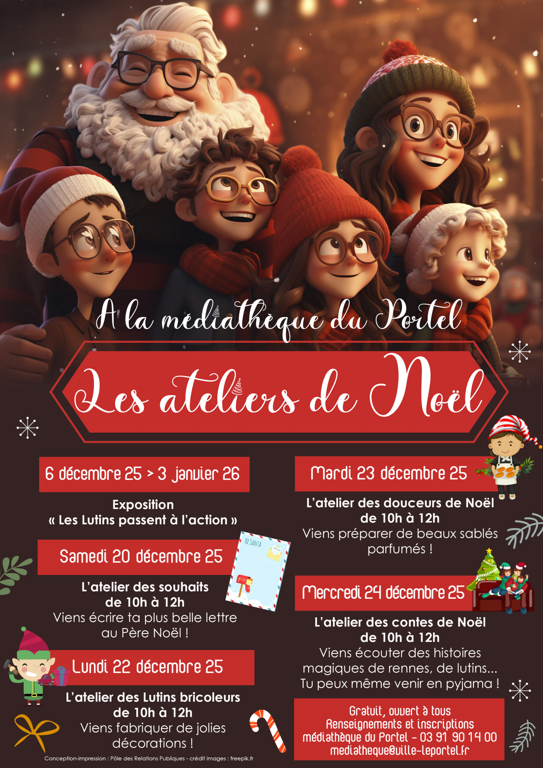 Du 6 décembre au 3 janvier exposition à la médiathèque : mise en scène des ateliers du père Noel.