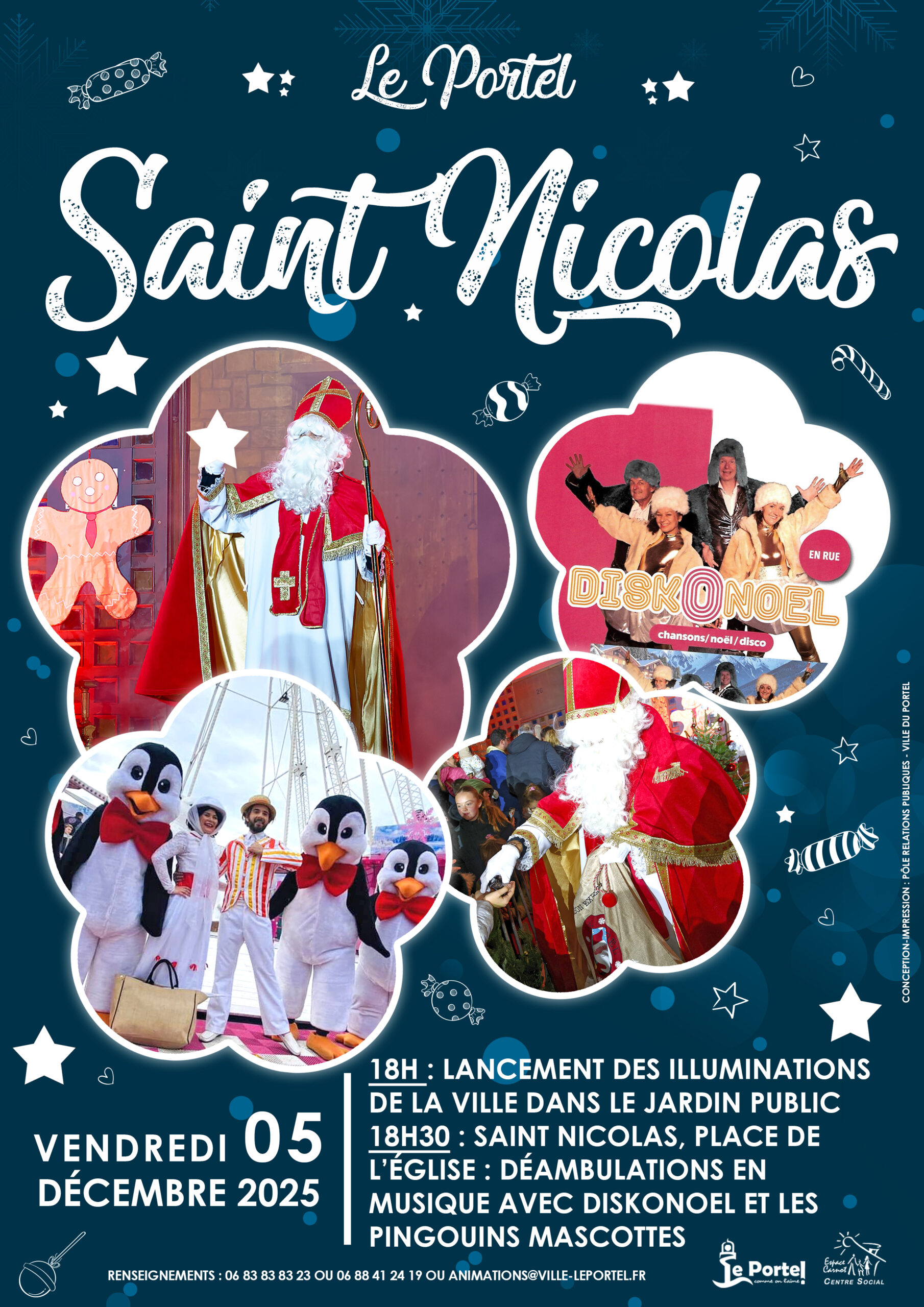 à 18h30 venez rencontrer St-Nicolas : déambulations en musique par DiskOnoel, mascottes, lancer de bonbons... St-nicolas fera sa traditionnelle tournée dans les écoles maternelles les 4 & 5 décembre.